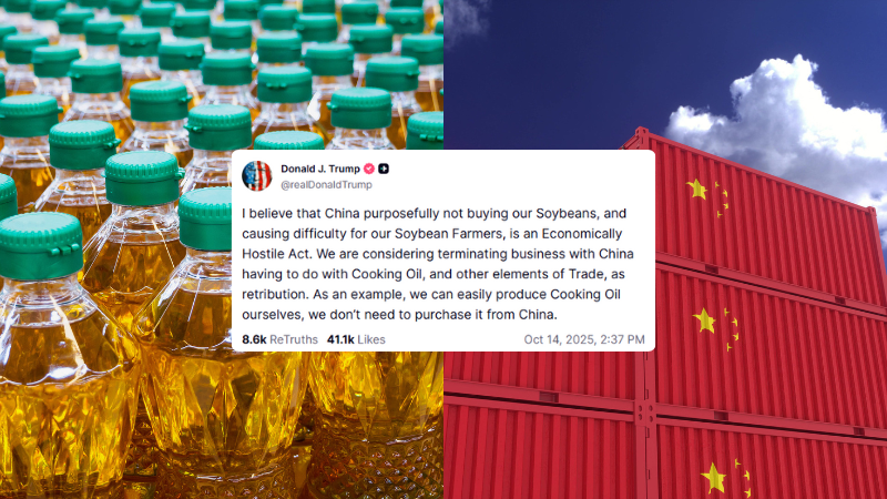 CHICAGO, October 15, 2025 — President Trump said Tuesday that he’s considering a complete shutoff of cooking oil imports from China as retaliation against the Asian mega-power for halting its purchase of soybeans from U.S. farmers.